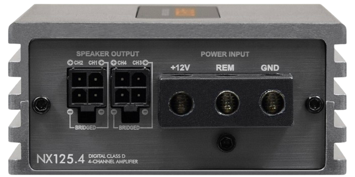 The NX125.4 is a high-efficiency 4-channel digital Class D amplifier designed for modern car audio systems that demand strong output, clean sound, and flexible tuning — all in a compact, installer-friendly size.